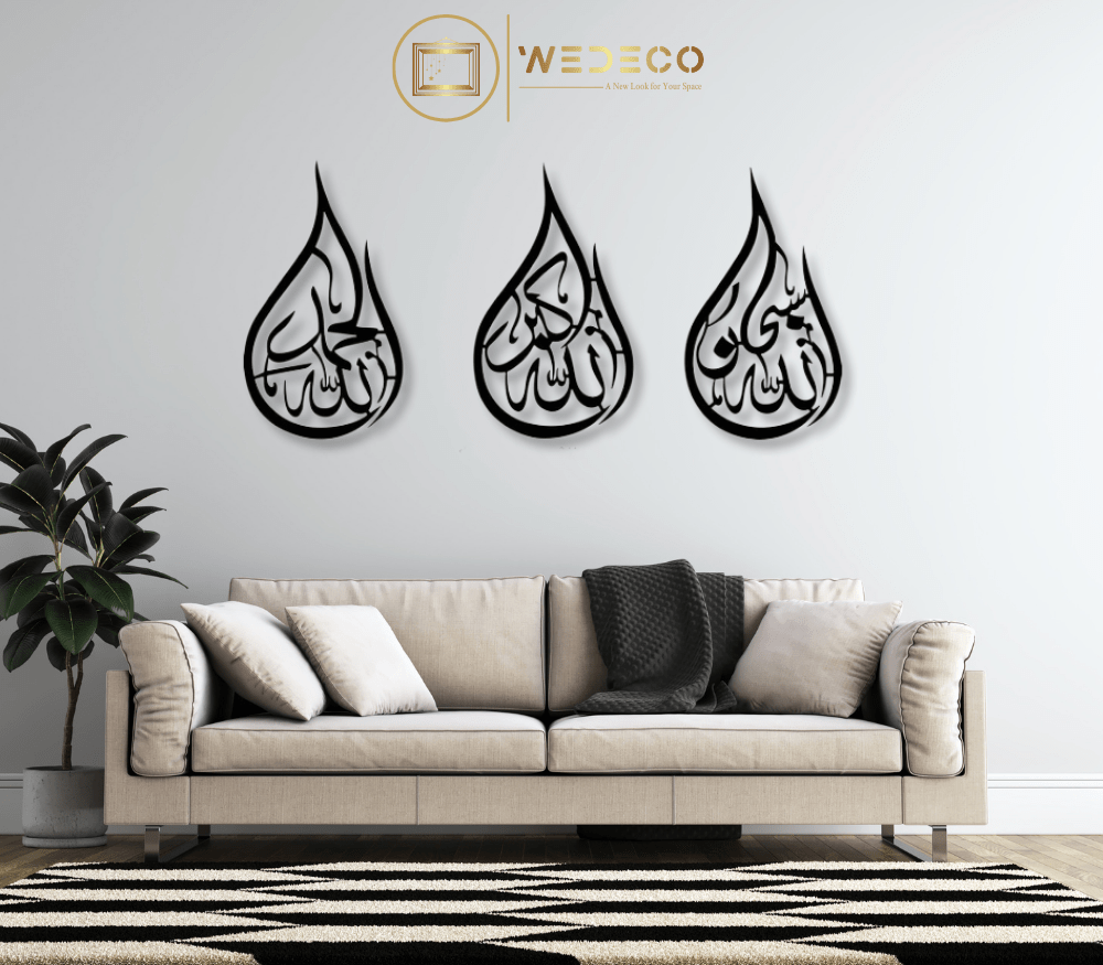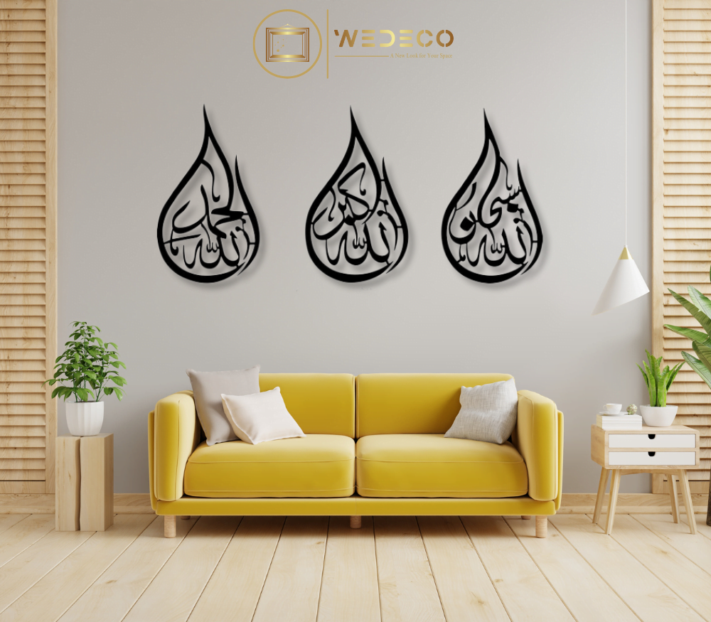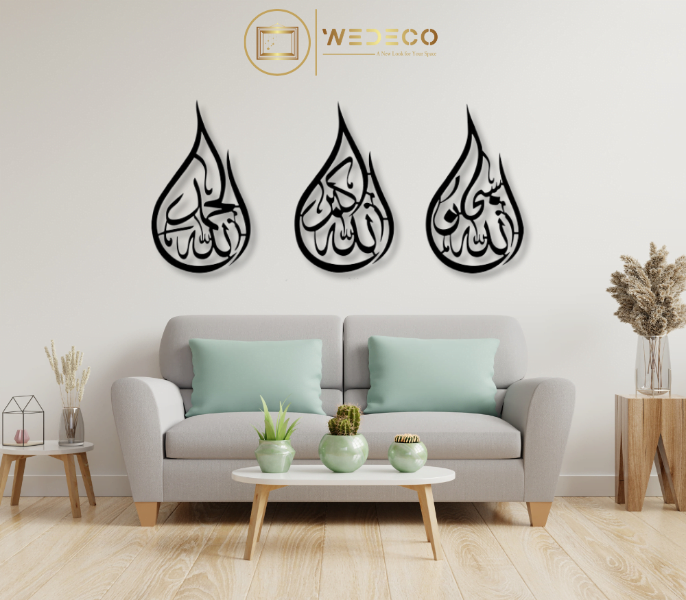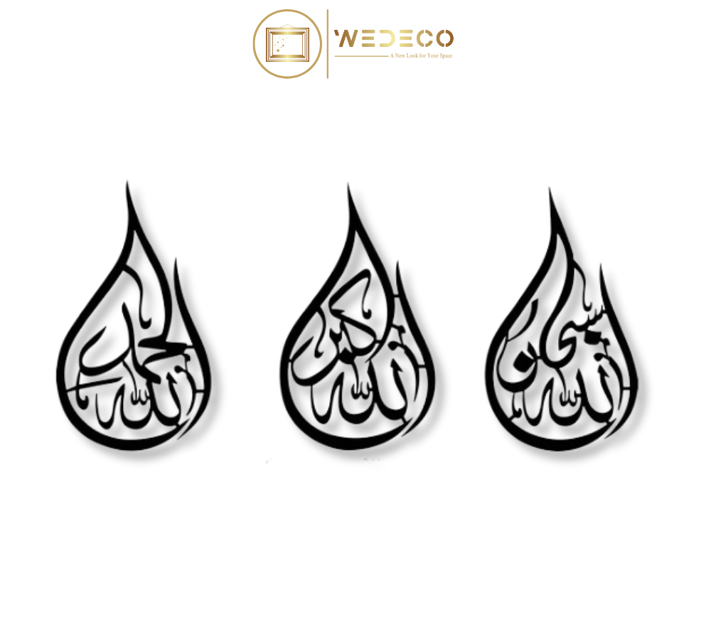 Apportez une touche spirituelle et artistique à votre intérieur avec notre Décoration Islamique en Forme de Gouttes d’Eau. Ce design raffiné présente les inscriptions ‘Subhana Lah’, ‘Allaho Akbar’, et ‘Alhamdo Lillah’ délicatement intégrées dans des formes de gouttes d’eau, symbolisant la pureté et la foi. Parfait pour embellir vos espaces avec une ambiance sereine et spirituelle, cette pièce est idéale pour les maisons inspirées par la foi et l’art islamique.