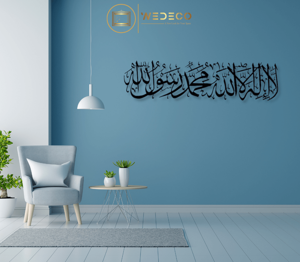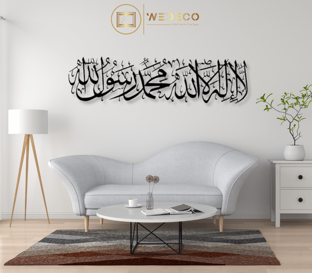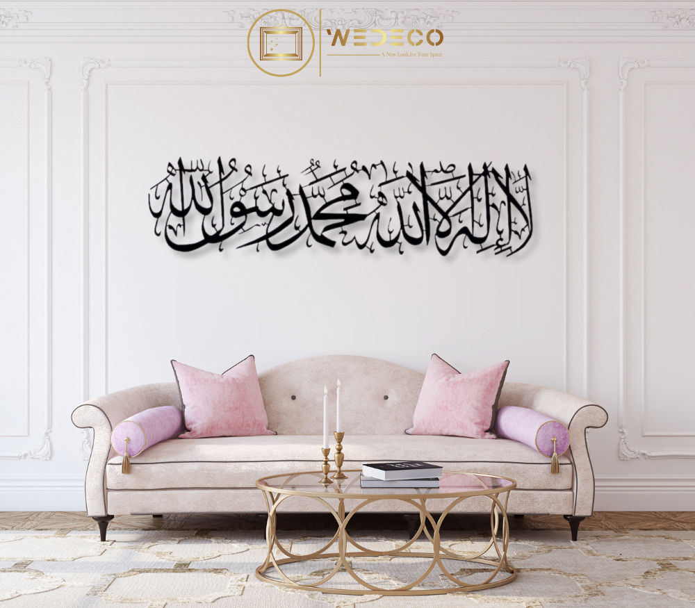 Ornez vos murs avec cette magnifique Décoration Murale Islamique mettant en valeur la Chahada, “La ilaha illa Allah, Mohamed Rasul Allah (صلى الله عليه وسلم)”, en calligraphie arabe artistique. Ce design élégant capture la beauté de l’écriture arabe tout en exprimant l’essence de la foi islamique. Parfait pour les intérieurs cherchant à allier spiritualité et art, cette pièce apportera une atmosphère de sérénité et de dévotion à votre espace.