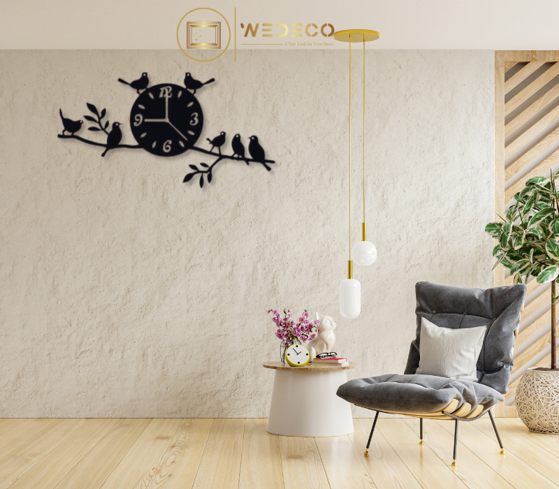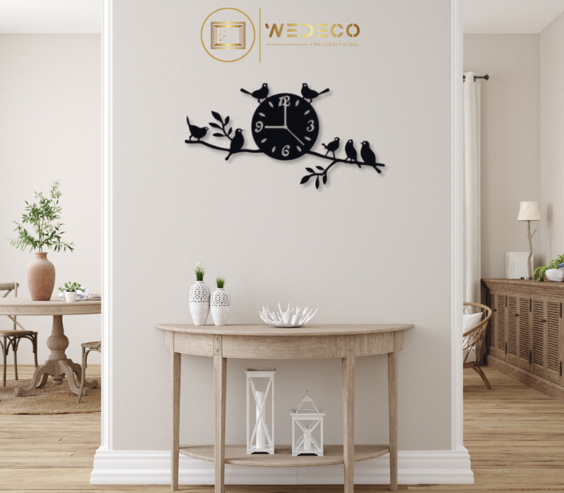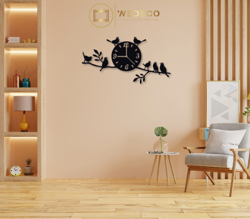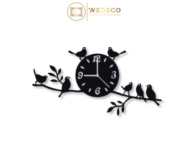 Cette horloge murale combine élégamment la fonctionnalité avec l’esthétique naturelle. Au centre se trouve l’horloge, d’où émanent deux branches d’arbre stylisées, chacune ornée de délicats oiseaux perchés. Le design apporte une atmosphère sereine et un charme rustique à votre intérieur, idéal pour les salons, les bureaux ou les chambres. Parfaite pour ceux qui apprécient les touches de nature et une esthétique artistique dans leur décor, cette horloge est à la fois pratique et belle.